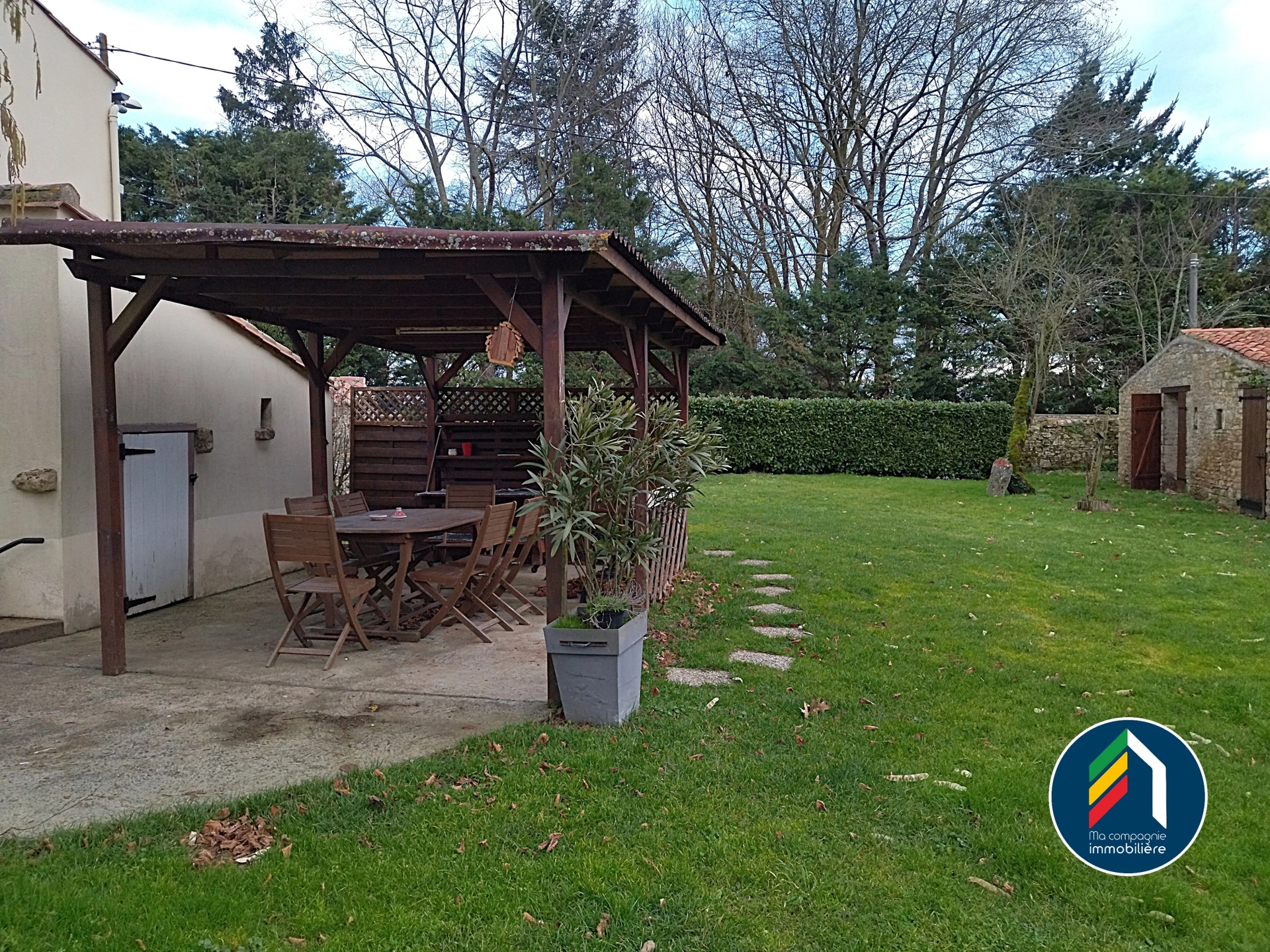 Le jardin est clos et arboré. On y retrouve une terrasse avec pergolas ainsi qu'un puits.