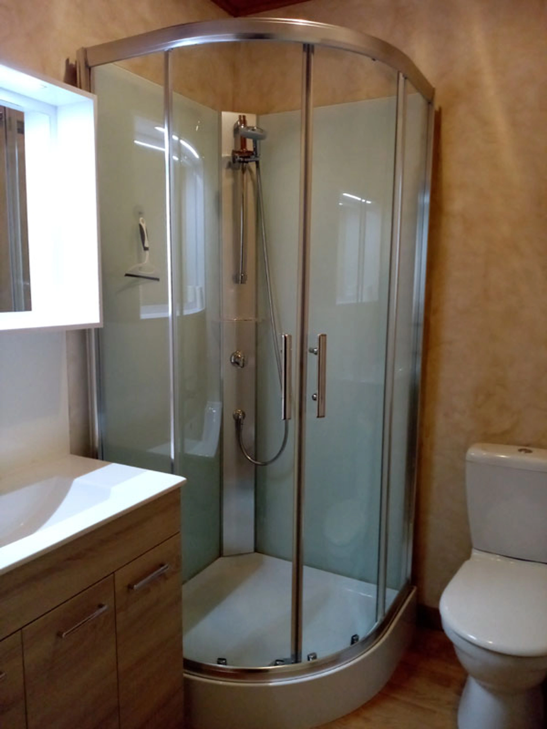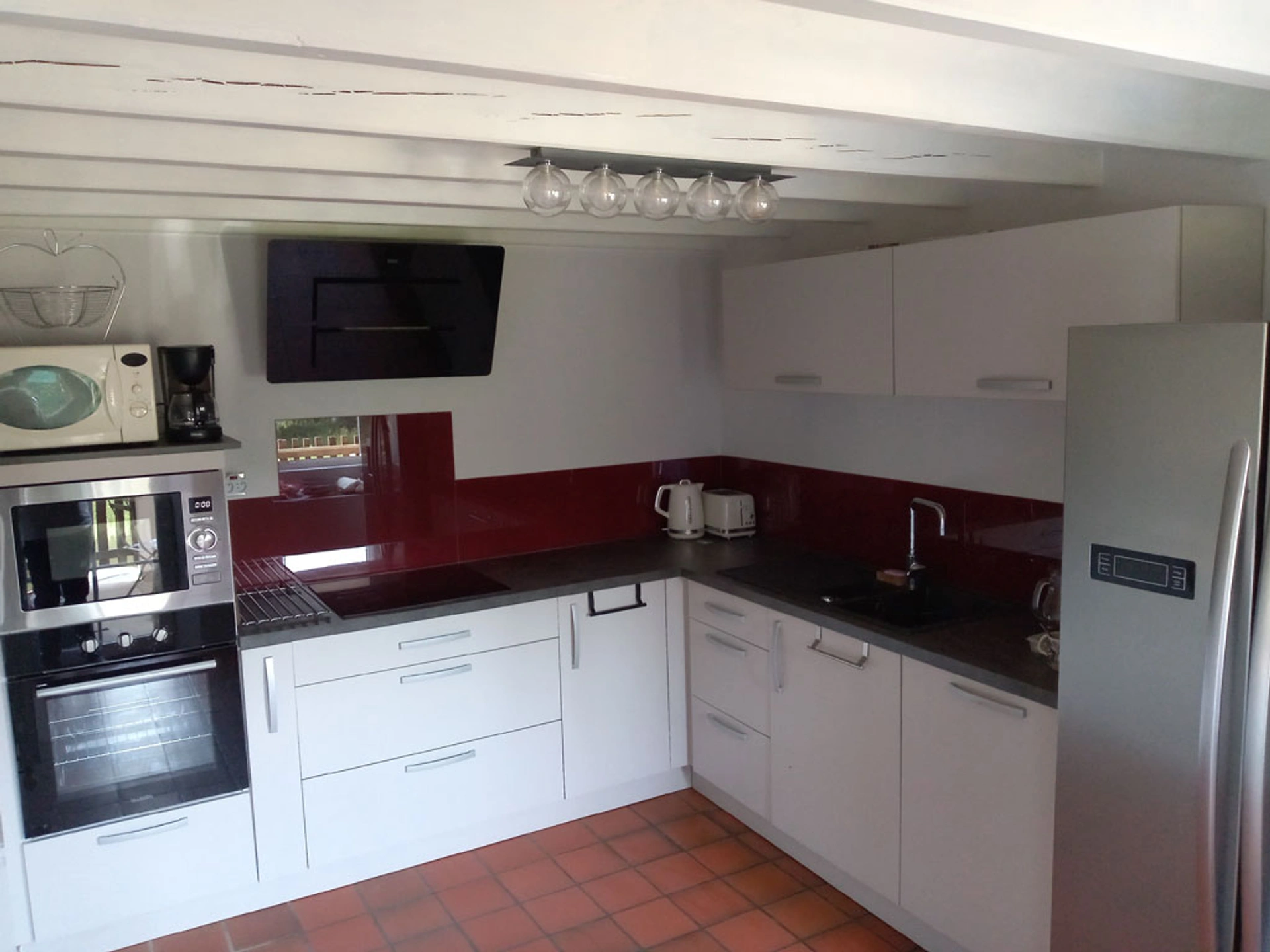 Depuis la cuisine, on accède à une terrasse avec vue sur la rivière.on y retrouve un barbecue, un préau et une petite dépendance.